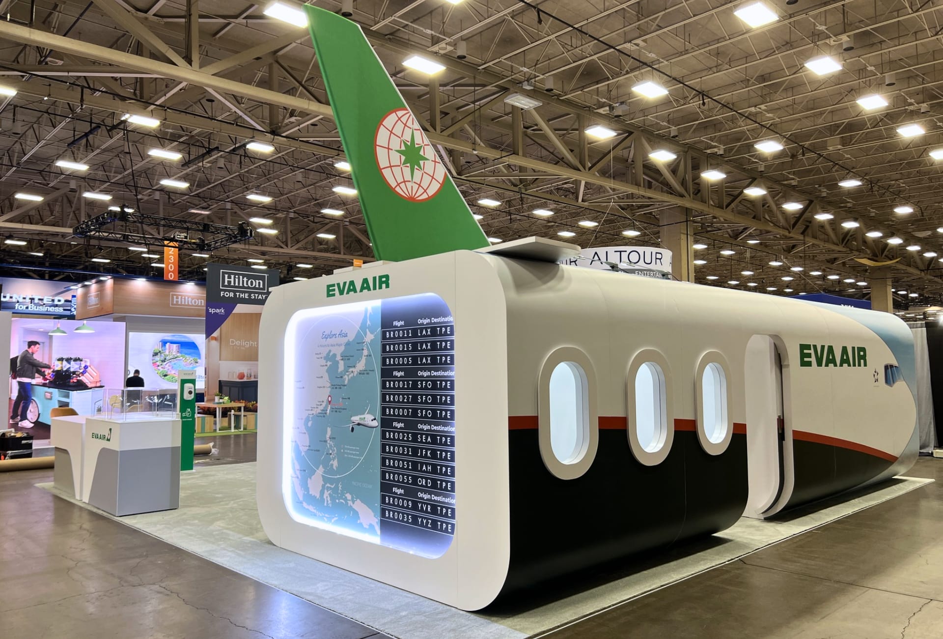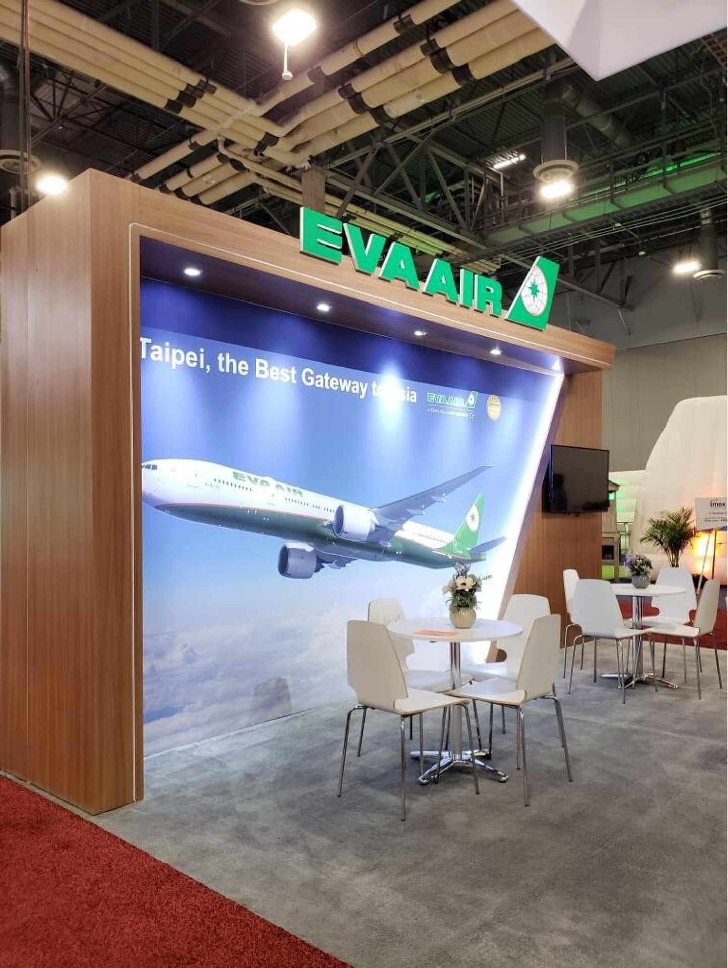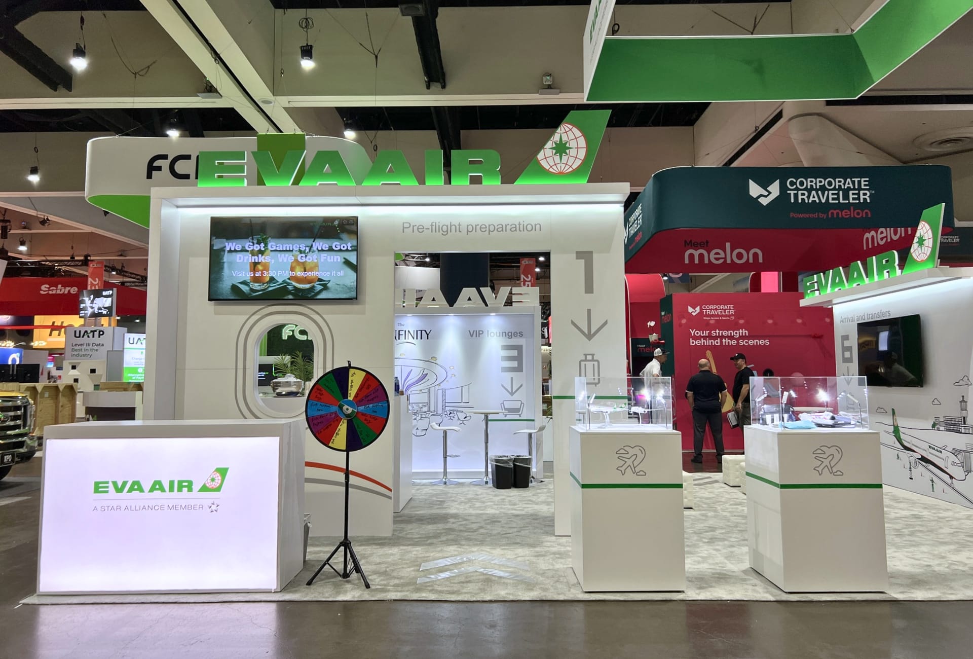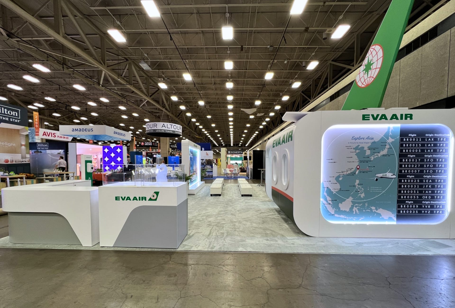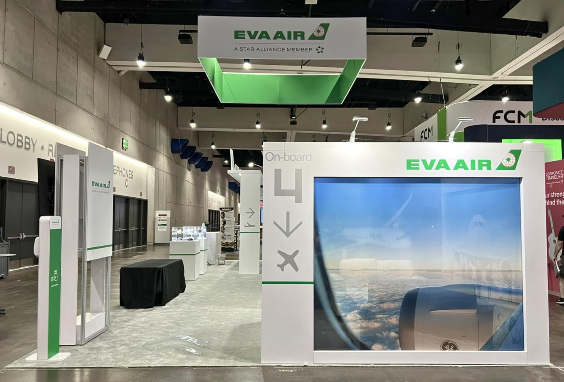 Eva Air, one of our long time clients, has been going to GBTA with us consistently! While each year the structure is similar, an upgrade is made to it every time. From a single graphic display to our newest airplane-shaped room structure, you can really see the progress each year.