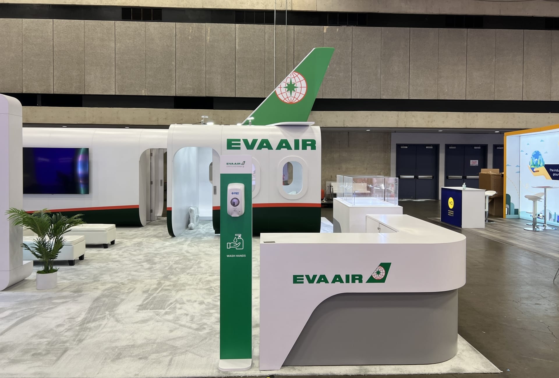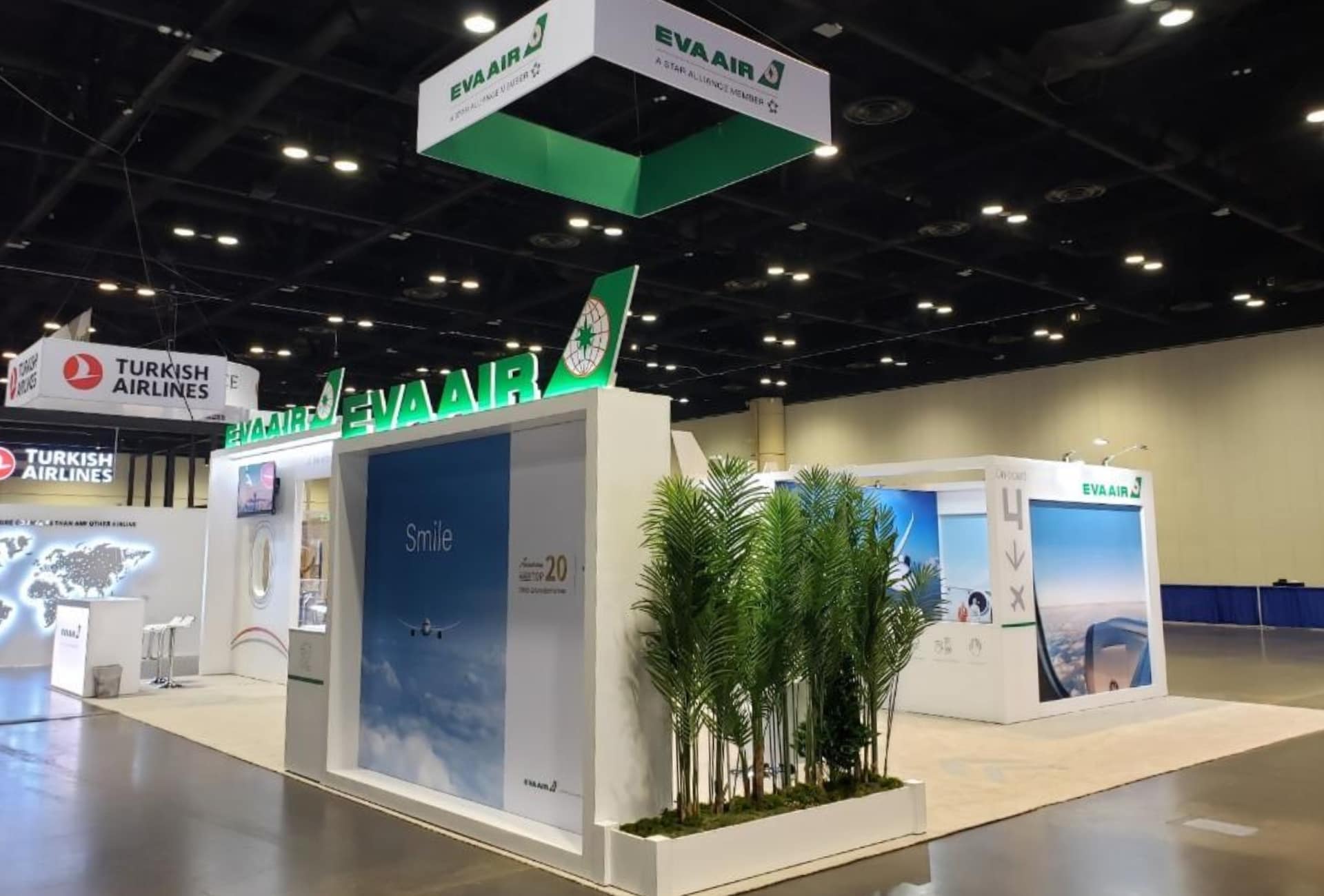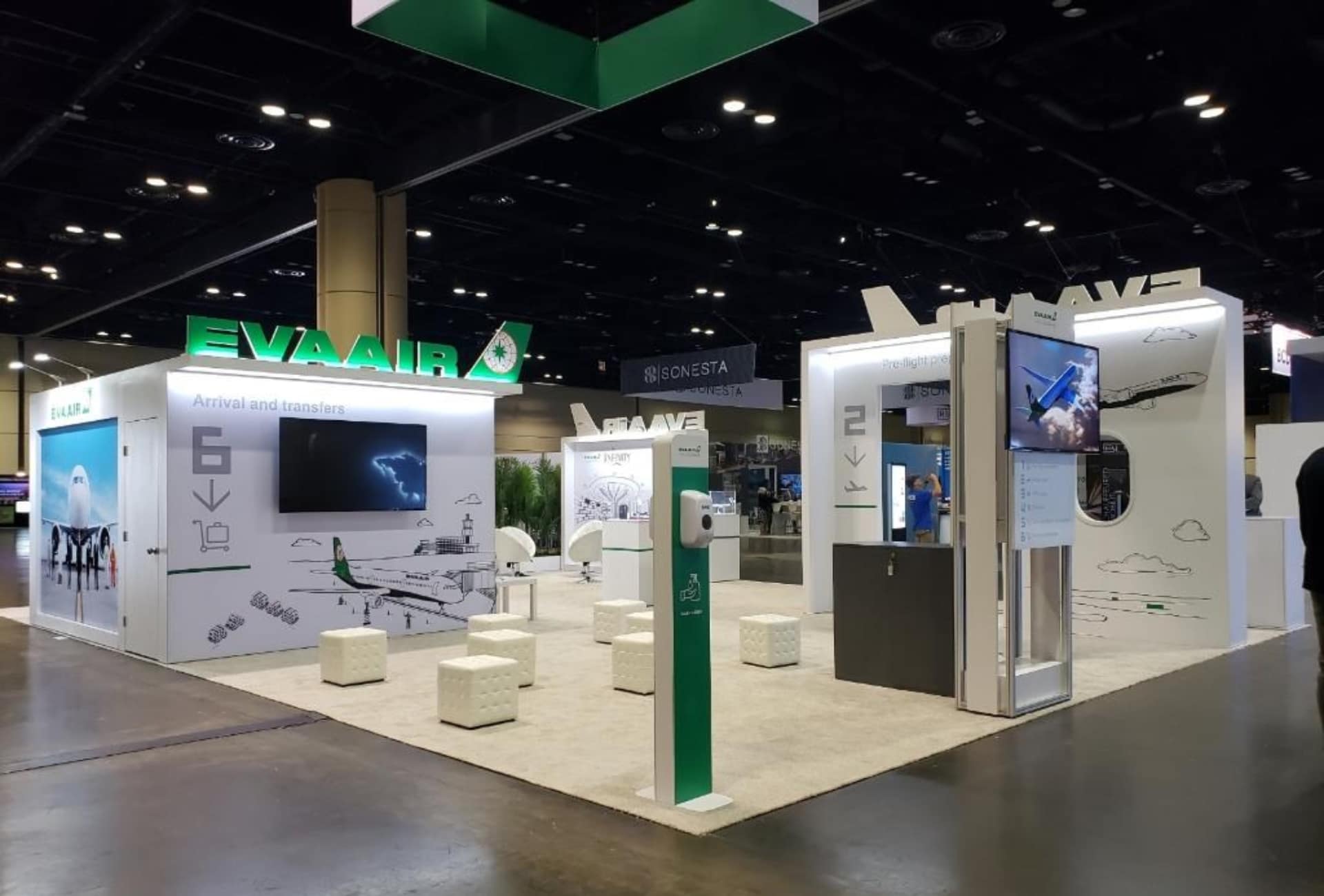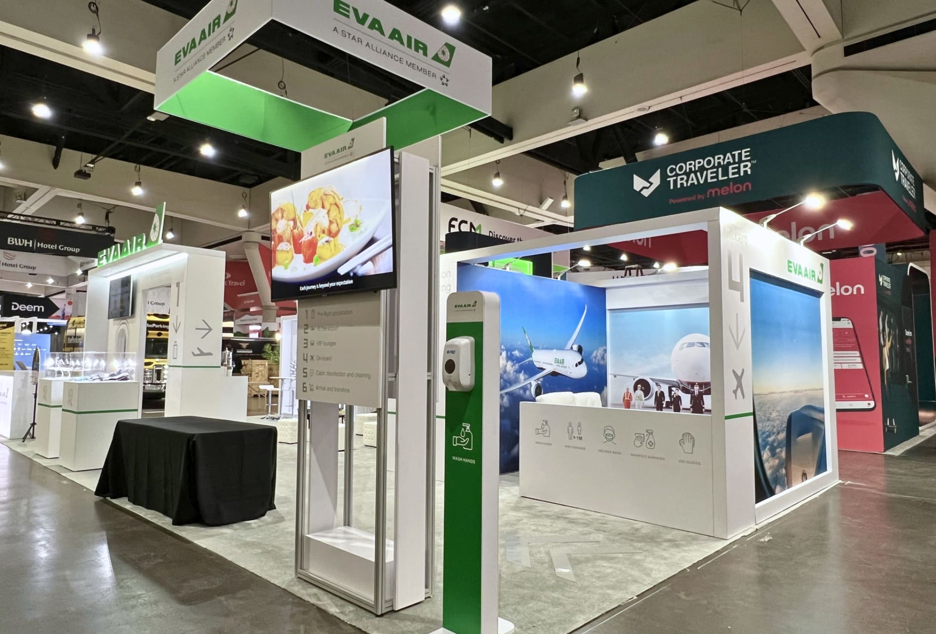 Eva Air, one of our long time clients, has been going to GBTA with us consistently! While each year the structure is similar, an upgrade is made to it every time. From a single graphic display to our newest airplane-shaped room structure, you can really see the progress each year.