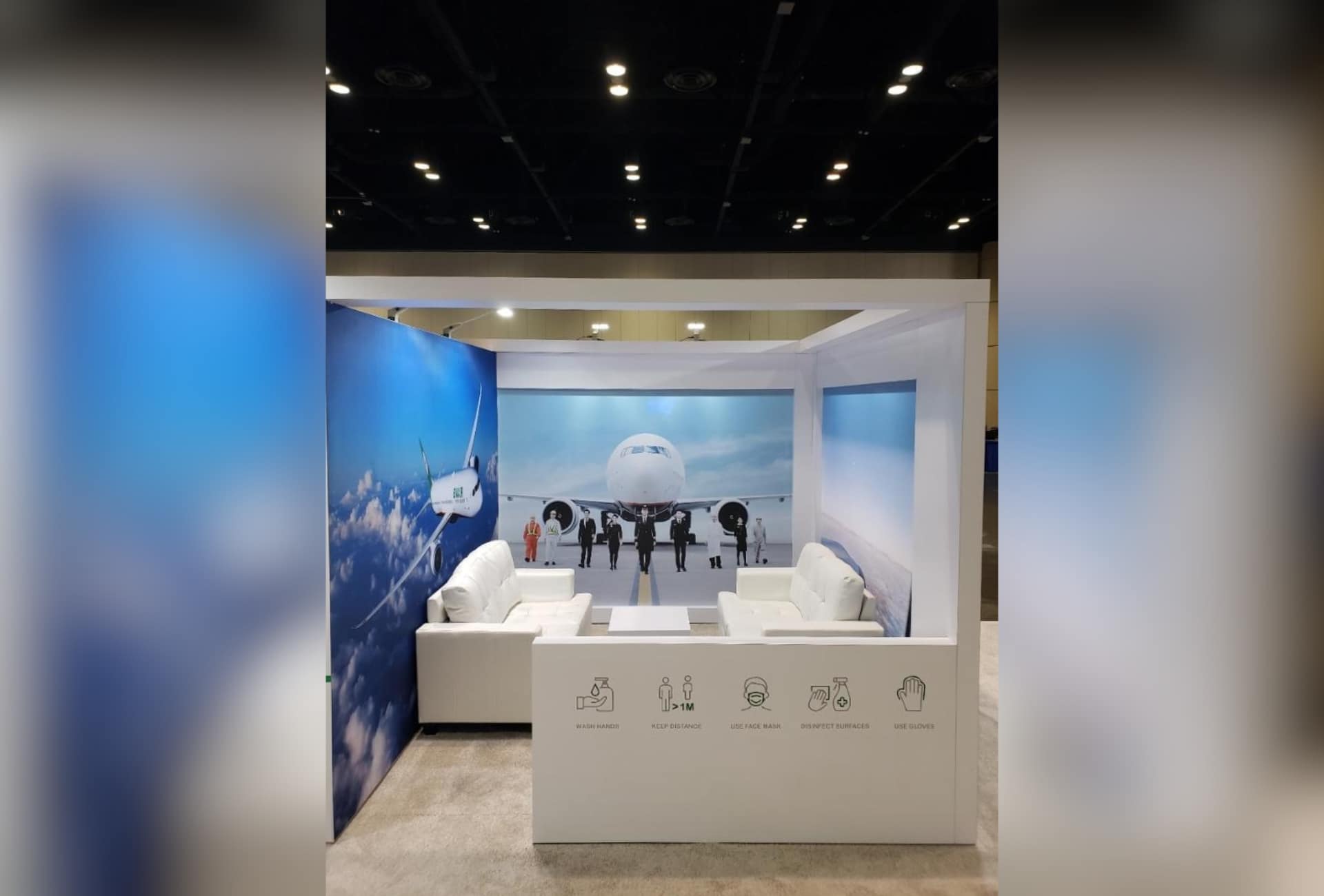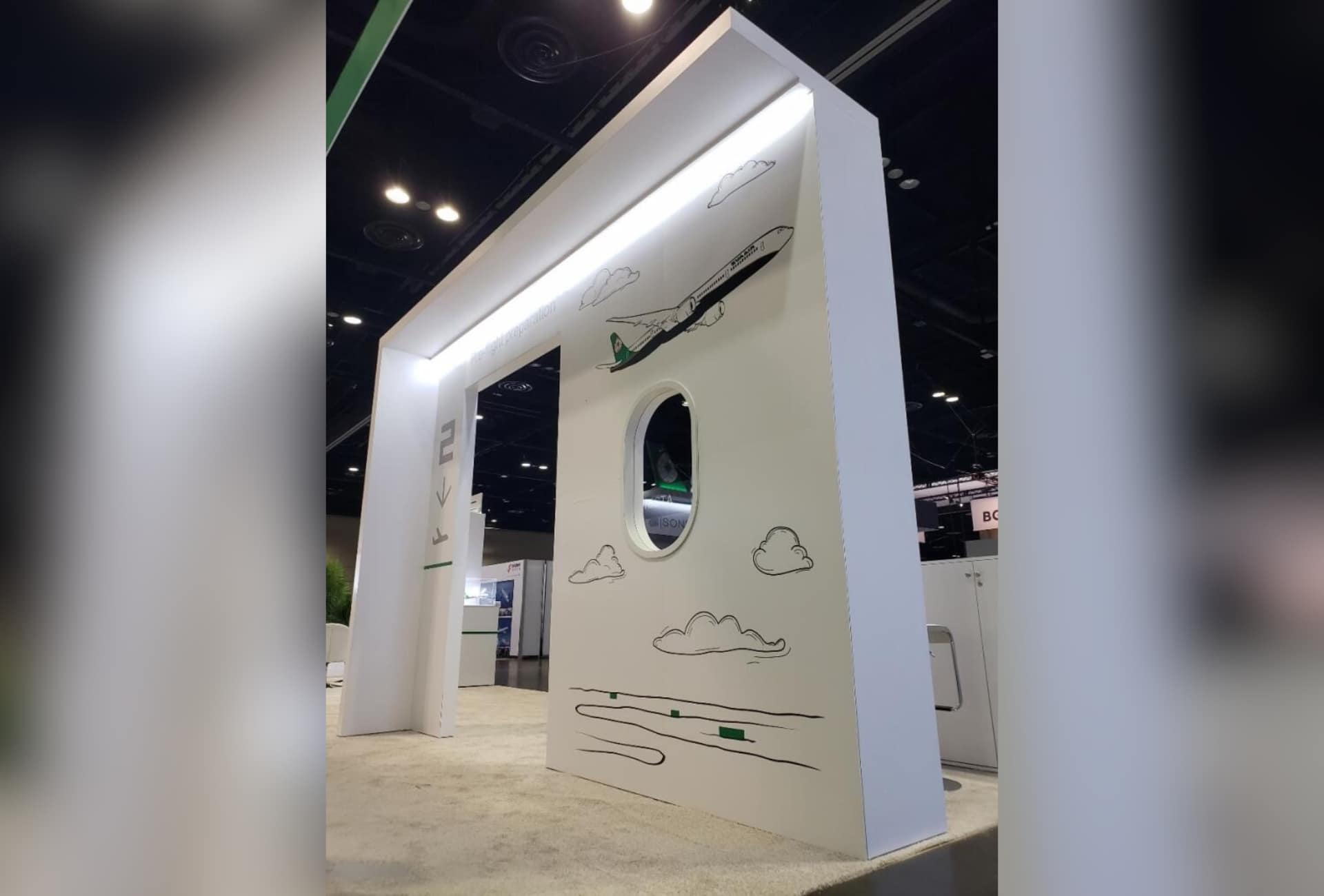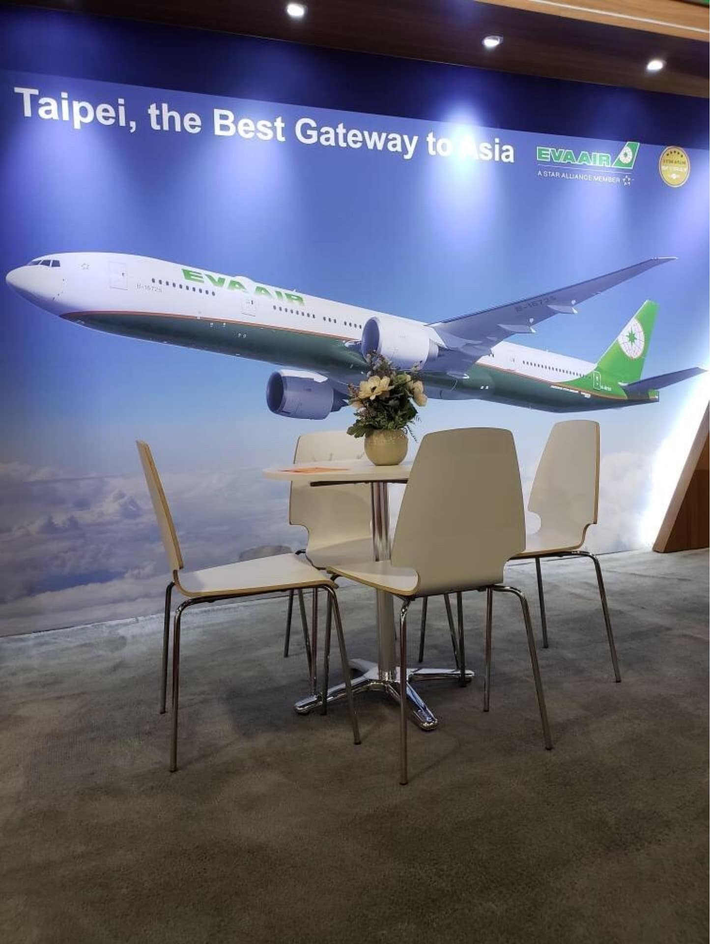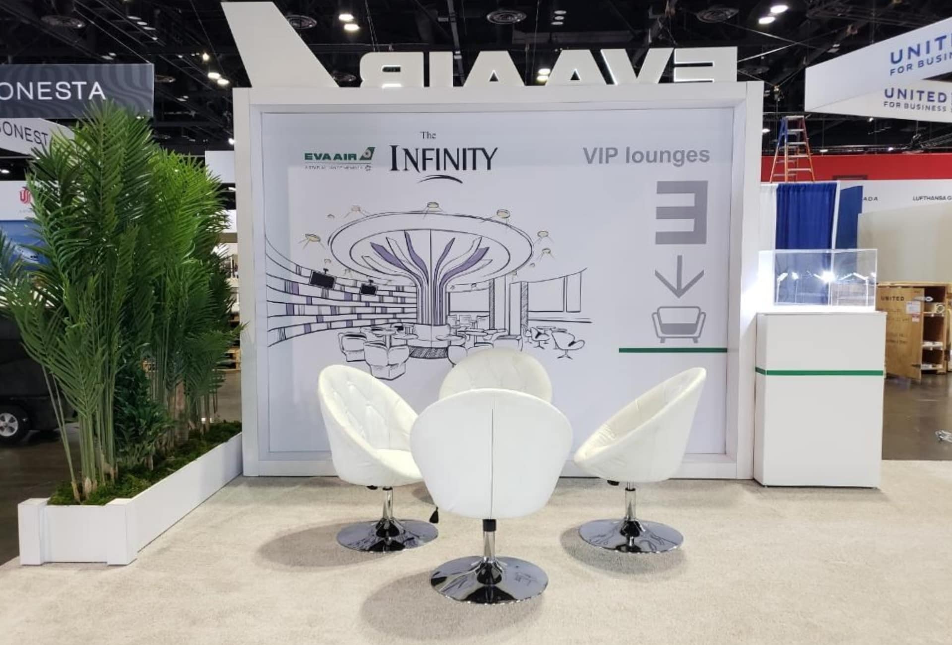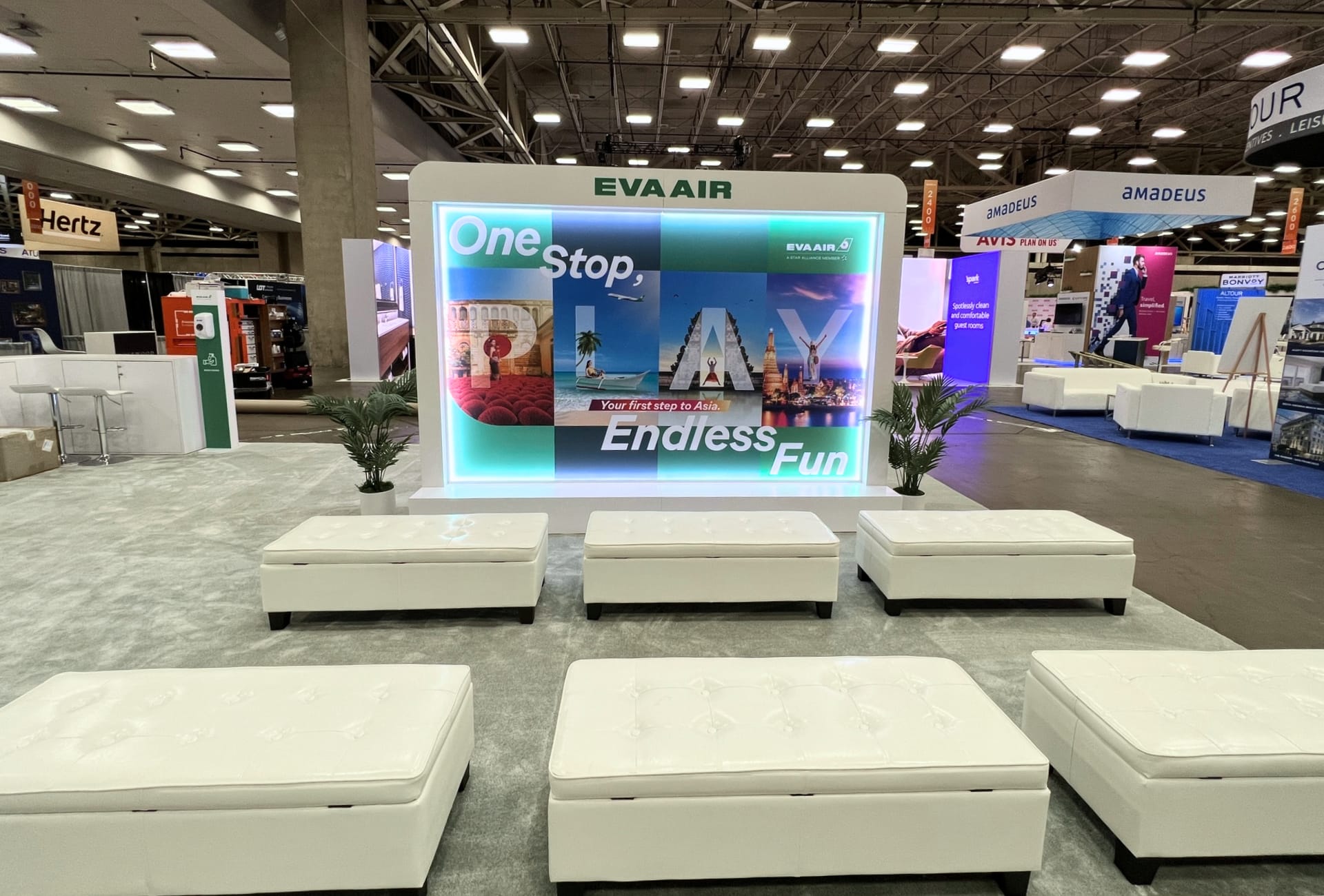 Eva Air, one of our long time clients, has been going to GBTA with us consistently! While each year the structure is similar, an upgrade is made to it every time. From a single graphic display to our newest airplane-shaped room structure, you can really see the progress each year.