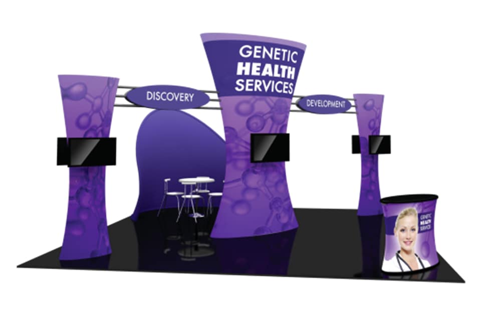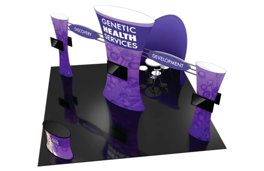 An airy floor plan encourages maximum traffic flow into this 20′ x 20′ island exhibit! Formulate® Fusion Kit 06 features structures that combine the latest developments in fabric printed technology with heavy-duty aluminum frames to create a space that fosters great traffic flow and conversation areas. The 12′ tall center fabric tower is connected to two 9′ tall fabric towers via exposed aluminum tube. Oval-shaped sintra panels are located on front and back sides of the aluminum tubes providing four messaging and branding areas. An oval-shaped fabric reception counter provides a fashionable, yet functional greeting area. Additionally, an 8′ tall “potato chip” shaped, curved fabric wall creates a semi-private conference/meeting area or projection wall within the space. Six monitor mounts are included. Internal LED light kits are not included, but can be purchased a la carte to add a glow within the three tower structures.
