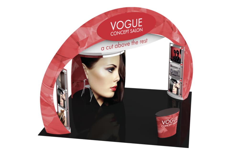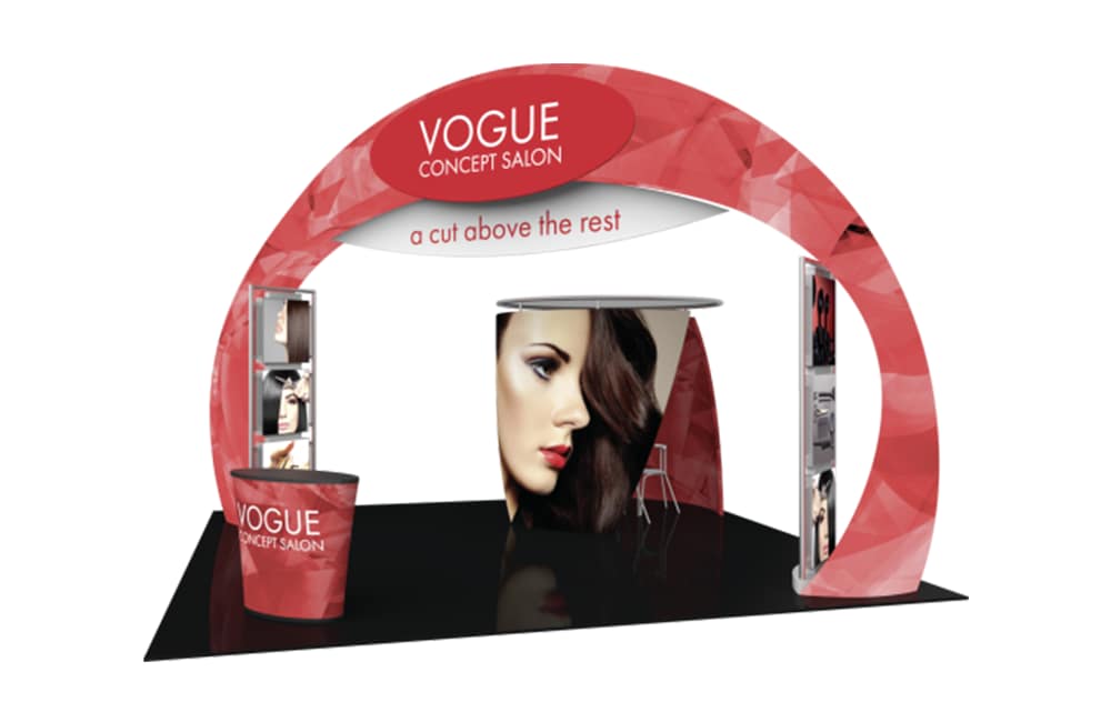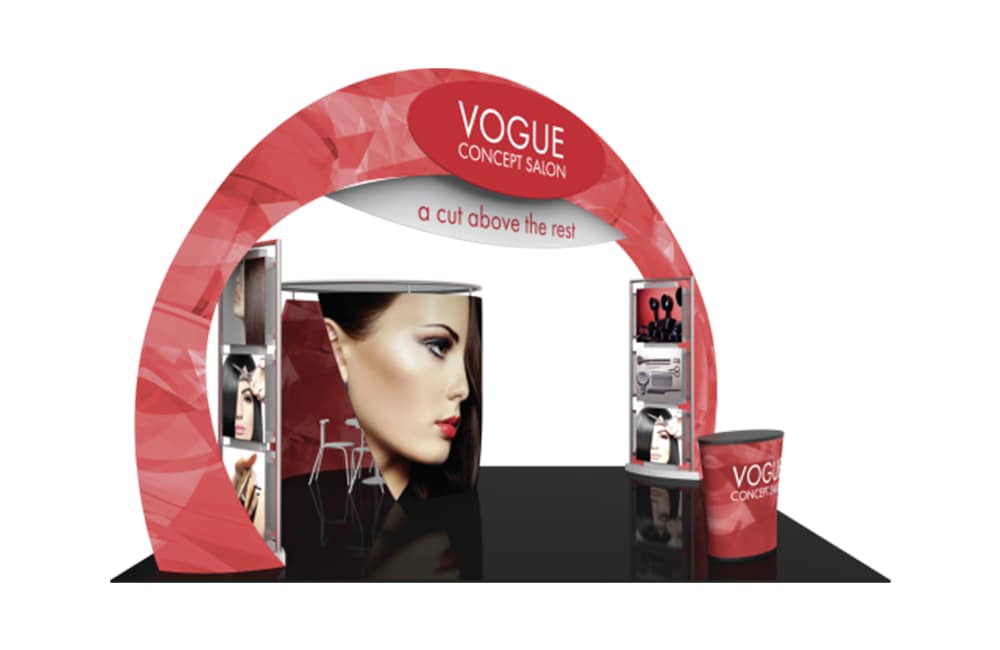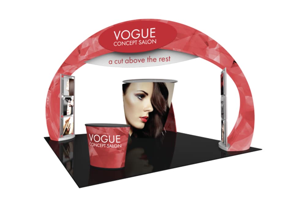 - Engage your audience inside this 20′ x 20′ island display at your next event! Formulate® Fusion Kit 08 provides ample floor space for traffic flow, product demonstrations and semi-private meetings. The main arch structure is 15′ 8″ tall and has a footprint that spans 27′ 3″, which requires that it is placed in a 20′ x 20′ exhibit space on a diagonal. Two oval-shaped accents mounted on the sides of the arch provide areas for company branding and messaging. Two structural accent displays are placed on the inside of the archway anchors, each featuring three 29.5″ illuminated squares that can be used to feature product or service images, taglines, branding and more. These displays stand 105″ tall and are 42″ wide. Host meetings in the semi-private conference room, which can fit a 36″ diameter bistro style table four chairs or stools. The oval fabric counter can be used for reception and storage.