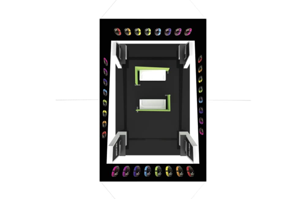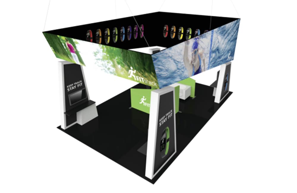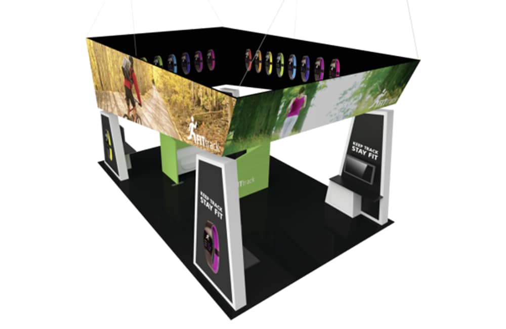 • This bold and dominant 20′ x 30′ exhibit certainly won’t be one that attendees simply walk past. A big, bold trapezoidal-shaped fabric structure hangs just slightly above the four mirrored trapezoidal-shaped corner towers. The large fabric hanging structure provides a plethora of real estate for branding, imagery and messaging to draw visitors into the exhibit space. The corner tower structures feature laminated wood perimeters and push-fit fabric graphics; wood counters stand in front of the towers, providing structural support and secure storage. Above each of the four counters are areas for large TV monitors to display digital media. In the center of the space are two L-shaped divider walls, designed to help create a semi-private space for meetings.