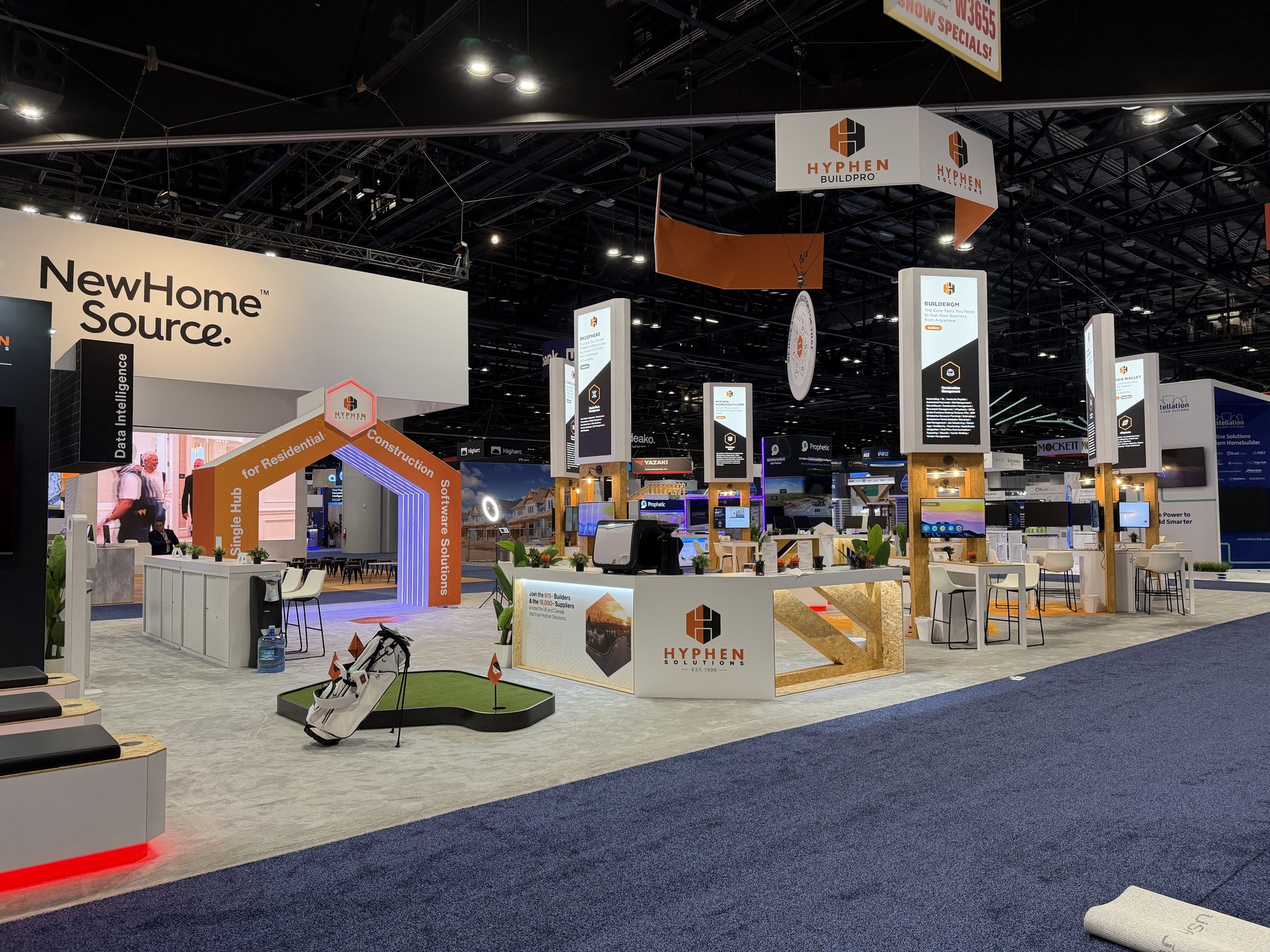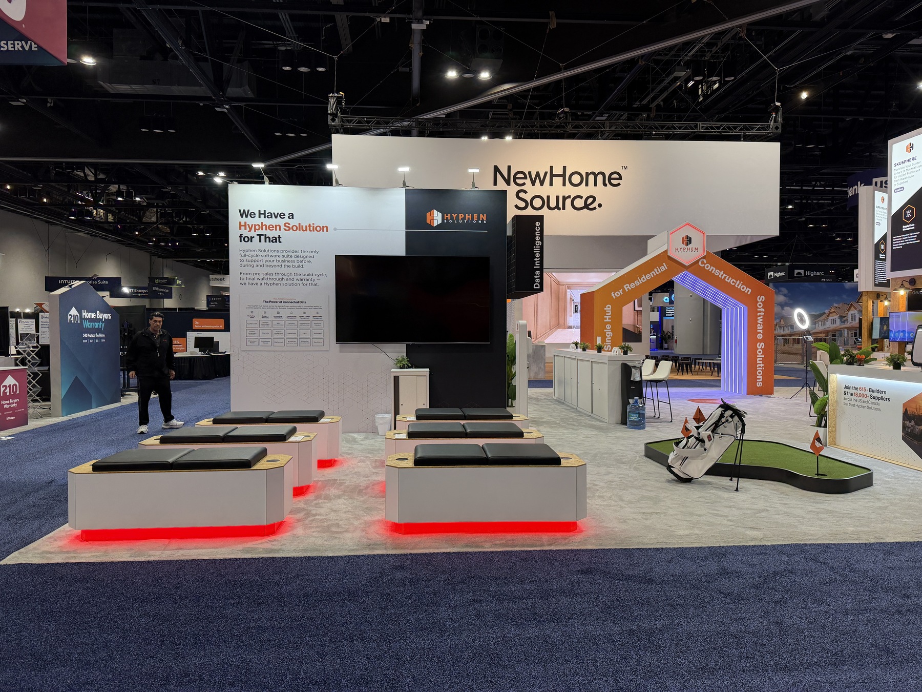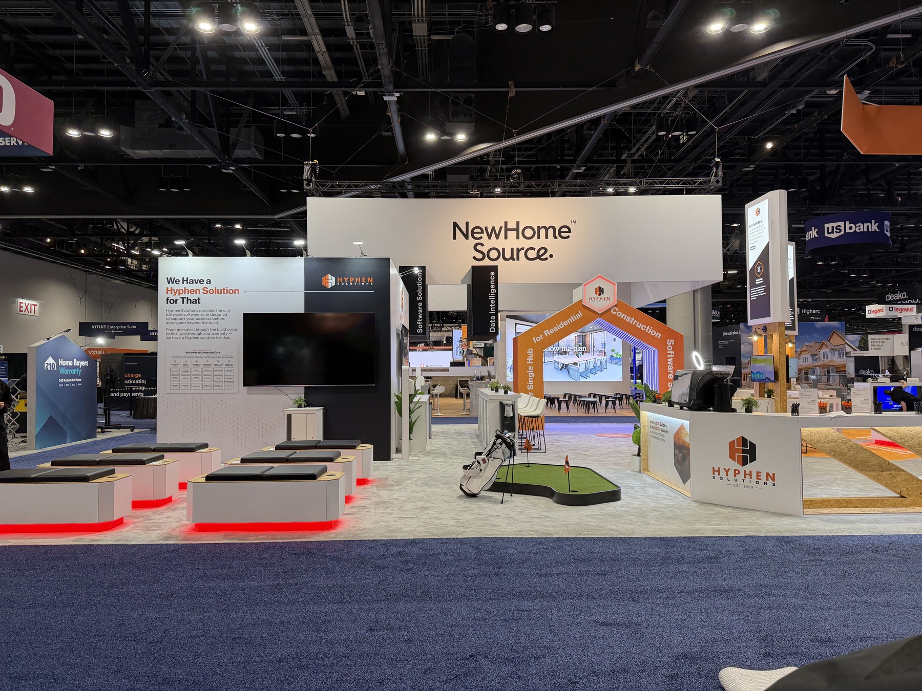Hyphen Solutions LLC. came to IBS 2026 at the Orange County Convention Center with a clear mandate: command attention in a hall full of builders, developers, and housing tech decision-makers. AMG designed and built a 40x80 custom exhibit — 3,200 square feet of branded environment — fully installed in under 3 days. The booth was engineered around Hyphen's core product story: integrated construction management software that connects every stakeholder from the builder to the trade partner. Every element, from the open floor plan to the demonstration stations, was built to move visitors from curiosity to conversation.
